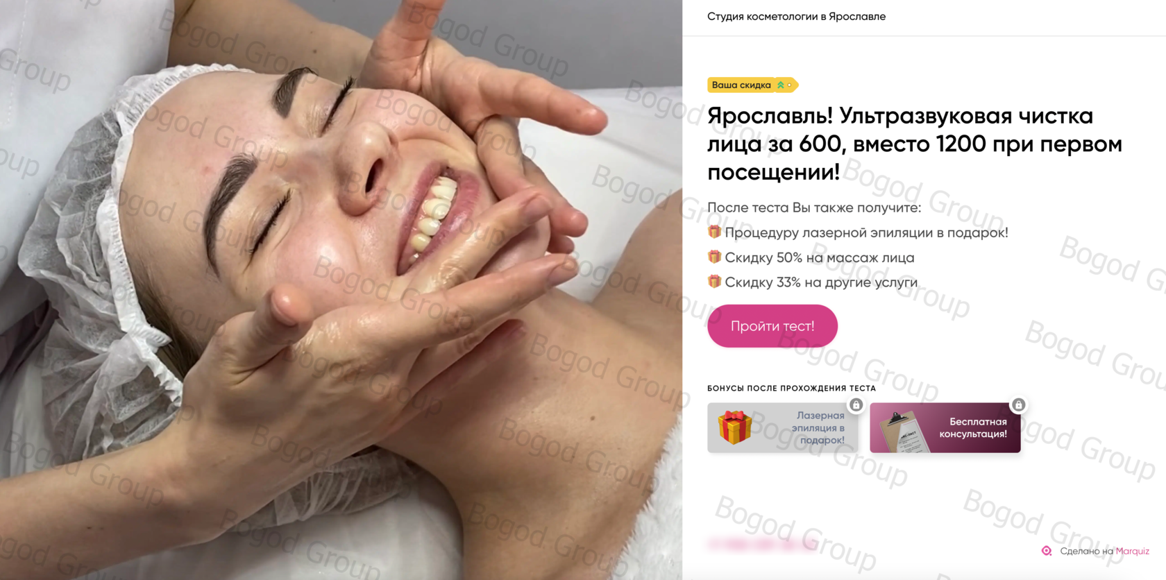 На фото изображен массаж лица, но именно оно показало лучшую конверсию стартовой страницы квиза.